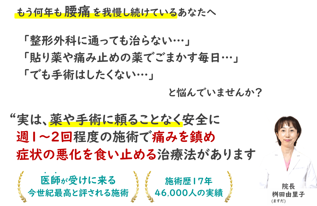 坐骨神経痛をはじめとする体中の痛みや辛さが、たった1~2回の施術で消えてしまう、医学学会でも効果が実証されたまさに魔法のような施術です。